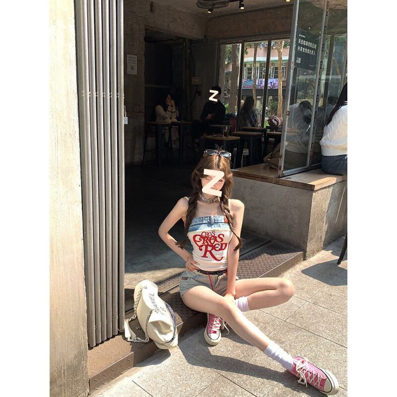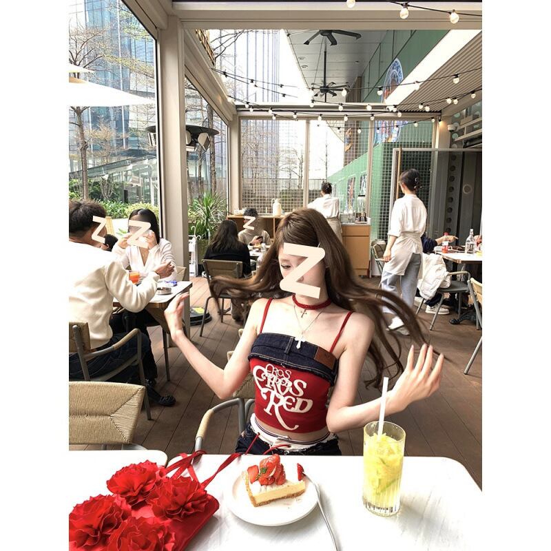 ロゴプリント×デニム切替 キャミソールトップス|春夏向け 配色デザイン ノースリーブ