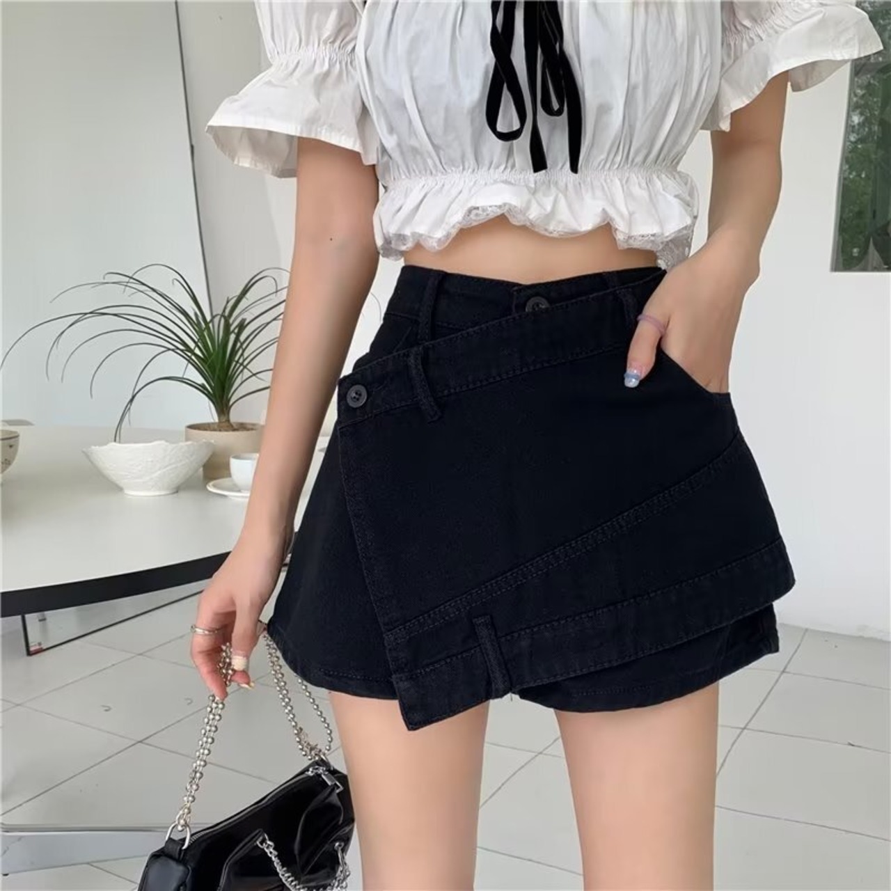 スカートのように見えるデザインで、短丈でも安心感があり、動きやすさも兼ね備えた1枚です。