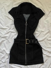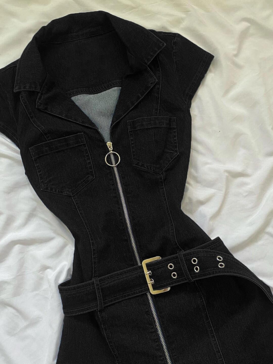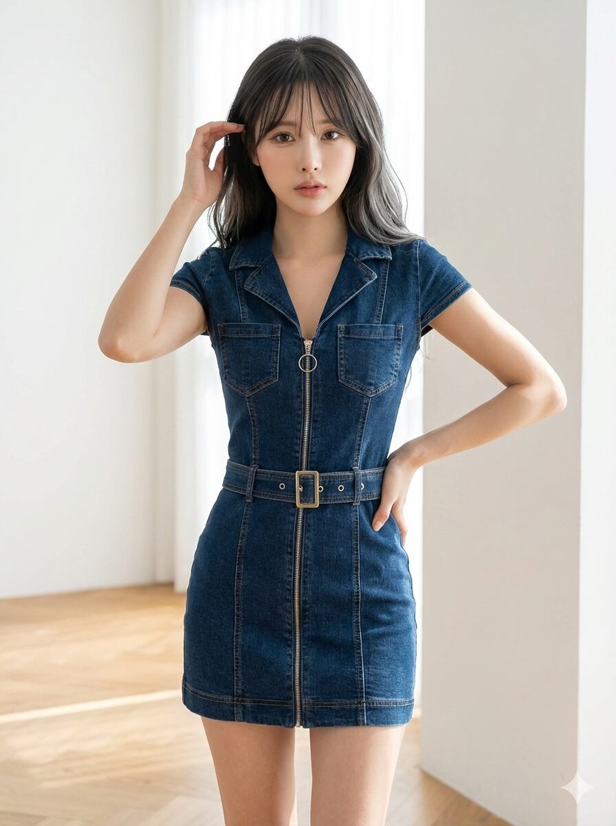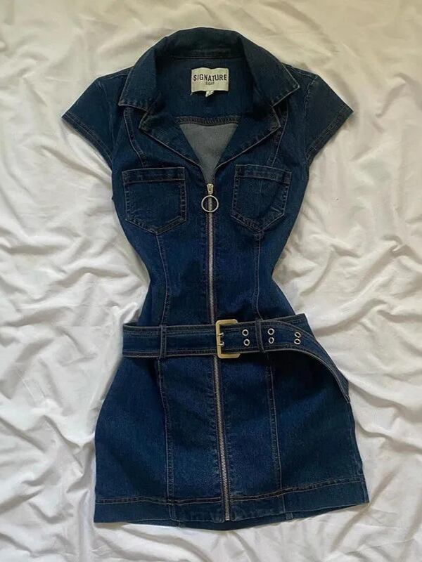 【ディープブルー】半袖デニムミニワンピース|ウエストベルト付き 春夏向け