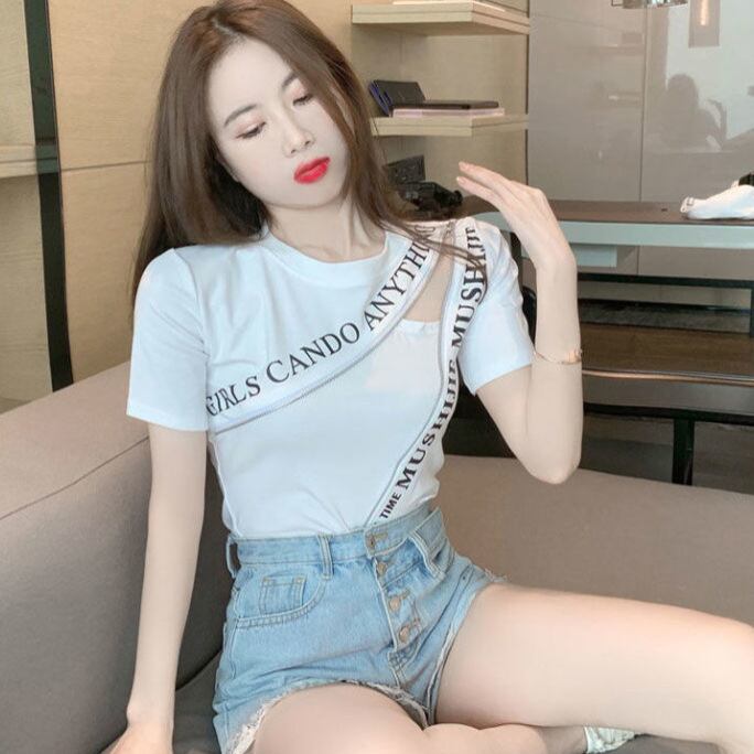 【ホワイト】夏向け デザイン切替コンパクトTシャツ レディース 半袖 フロントジップ すっきりシルエット