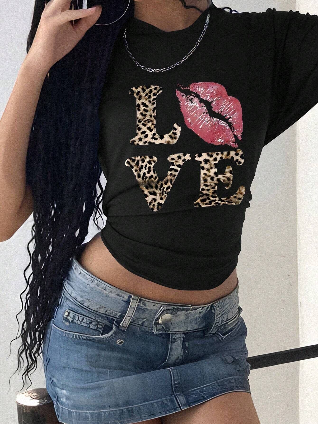 【ブラック】Y2K風 レオパード柄 LOVEプリントTシャツ レディース 半袖 クルーネック 夏トップス