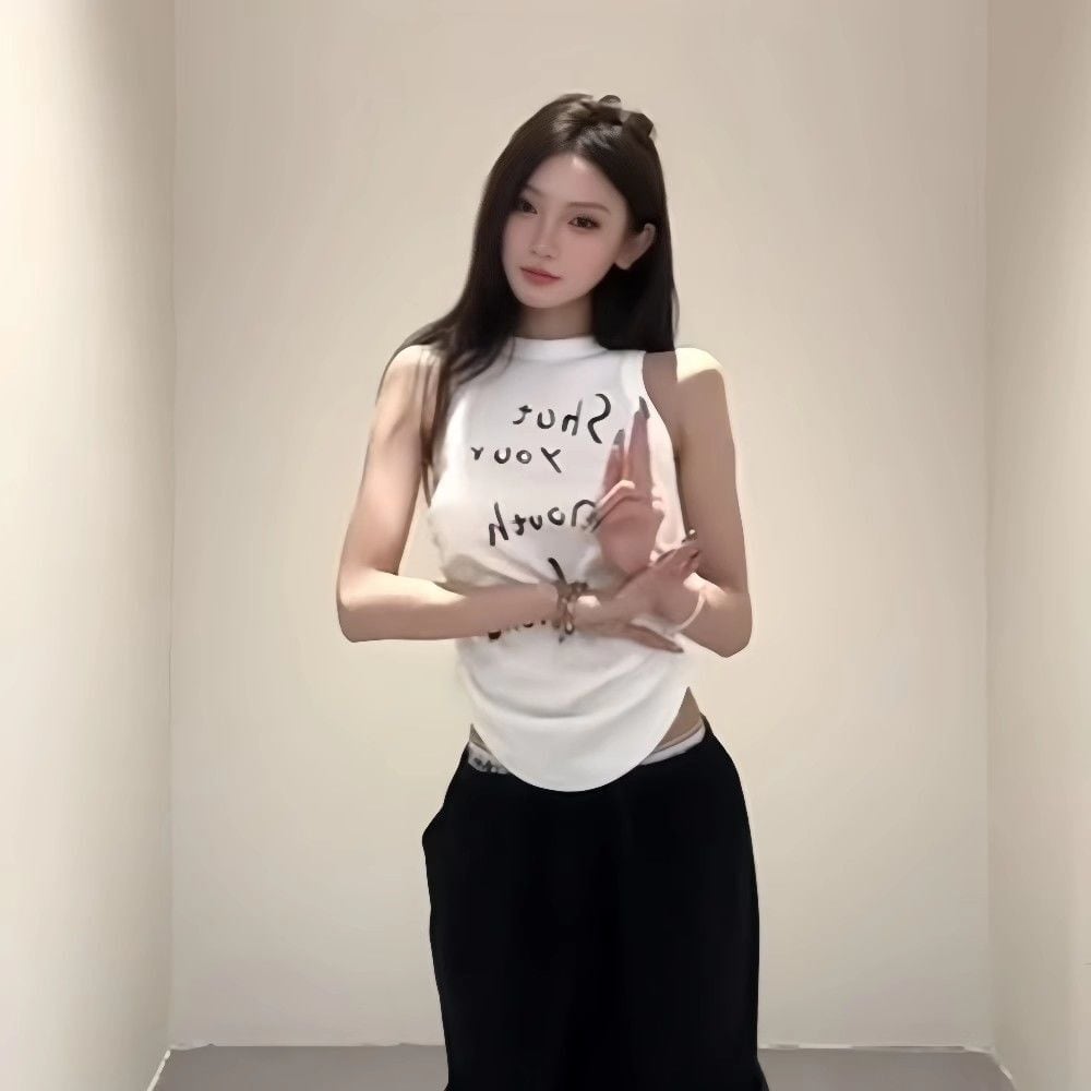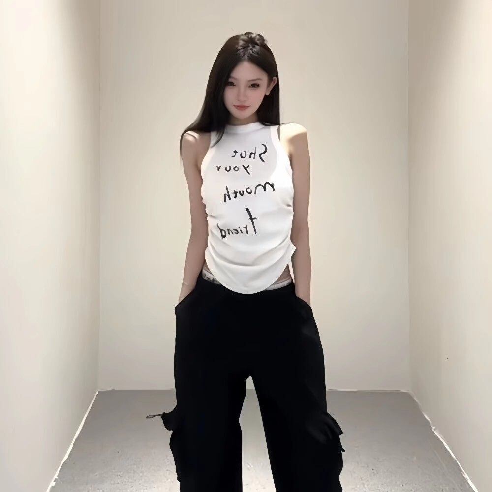 【ホワイト】2026夏新作 アメリカンスリーブ ロゴタンクトップ|クロップド丈・細身・辛口レディ・ブラック/ホワイト